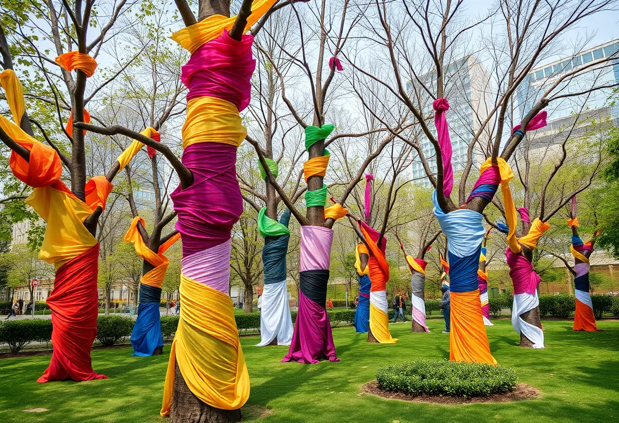 Trees wrapped in colorful fabric at Jacobson Park during Lexington's Tree Week